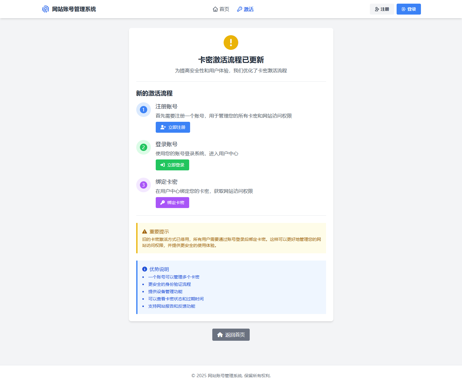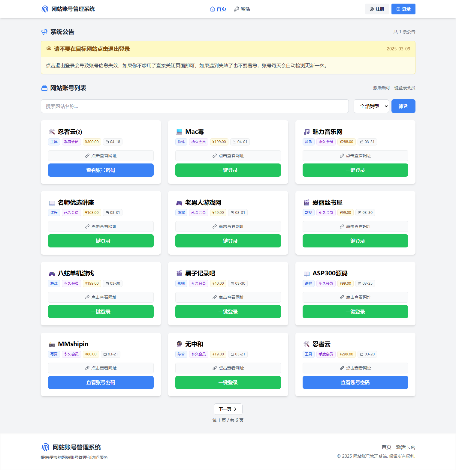主题介绍 提供便捷的网站账号管理和访问服务,支持一键自动登录目标网站,免去繁琐明文密码输入,保证账号的安全性,支持卡密生成、管理,是一款适用于vip会员账号共享合租、拼车网站的账号管理系统,程序全开源,无加密。 主题亮点 ✔一键登录✔密码查看✔设备限制 ✔用户中心✔卡密系统 主题预览 首页 分类页1 分类页2 温馨提示:1、退出账号直接关闭网页即可,切换账号请使用登录助手退出功能;2、请勿修改账号密码和信息、将账号分享给他人,发现封禁账号;3、账号问题可点击反馈或联系客服,其它问题请先查看 帮助中心。