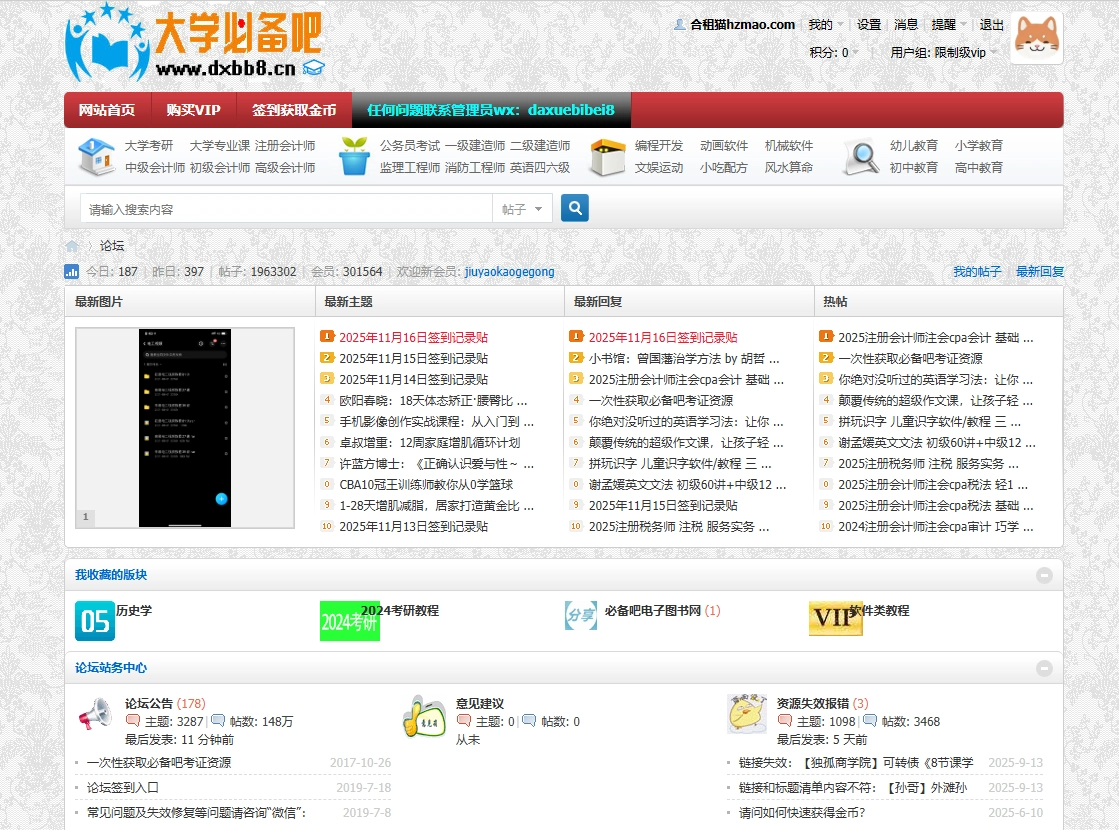 网站简介 大学必备吧是一个学习视频资料分享网站,提供大学课程、幼儿、小学、初中、高中、it、公务员、建造师、会计师等学习视频资料网盘分享。 一键登录 已隐藏 本内容需权限查看 解锁权限 12.8 升级VIP VIP会员: 免费 查看提示 今日查看次数不足或会员权限不足,请升级会员或明天再来试试吧!(今日已查看0个,还可查看2个) 升级VIP 网站预览 温馨提示:1、退出账号直接关闭网页即可,切换账号请使用登录助手退出功能;2、请勿修改账号密码和信息、将账号分享给他人,发现封禁账号;3、账号问题可点击反馈或联系客服,其它问题请先查看 帮助中心。