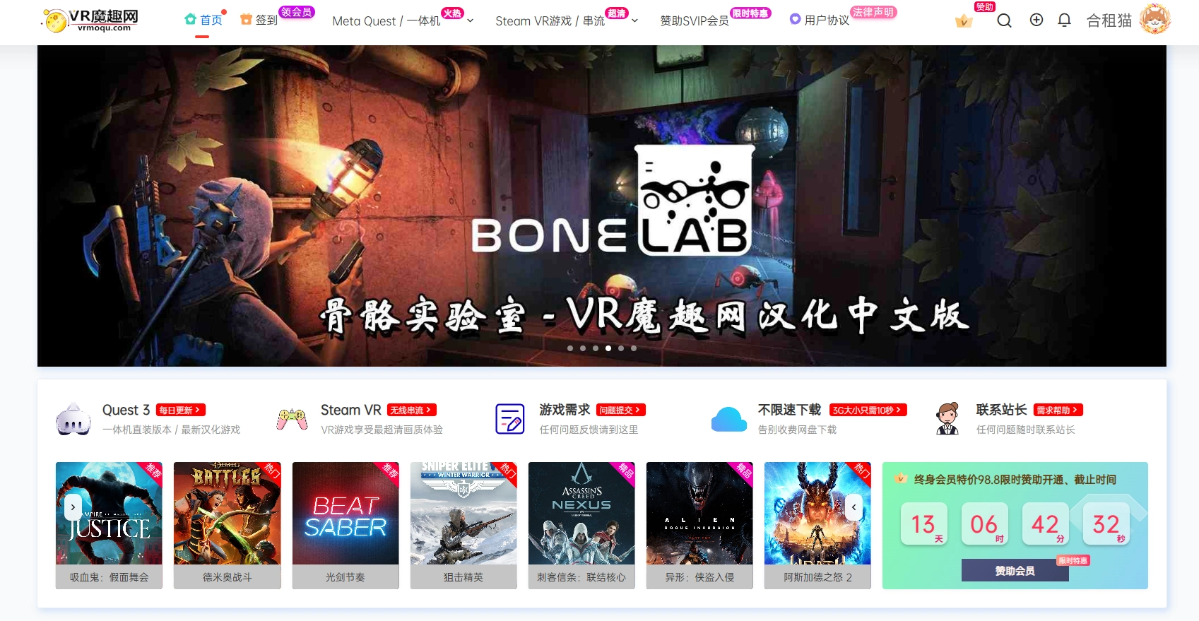 网站简介 VR魔趣网是一个VR游戏下载网站,提供海量VR游戏、VR汉化资源下载,资源全面、技术专业、经过多年努力已成为首选的VR资源网。 一键登录 已隐藏 本内容需权限查看 解锁权限 7.8 升级VIP VIP会员: 免费 查看提示 今日查看次数不足或会员权限不足,请升级会员或明天再来试试吧!(今日已查看0个,还可查看2个) 升级VIP 网站预览 温馨提示:1、退出账号直接关闭网页即可,切换账号请使用登录助手退出功能;2、请勿修改账号密码和信息、将账号分享给他人,发现封禁账号;3、账号问题可点击反馈或联系客服,其它问题请先查看 帮助中心。